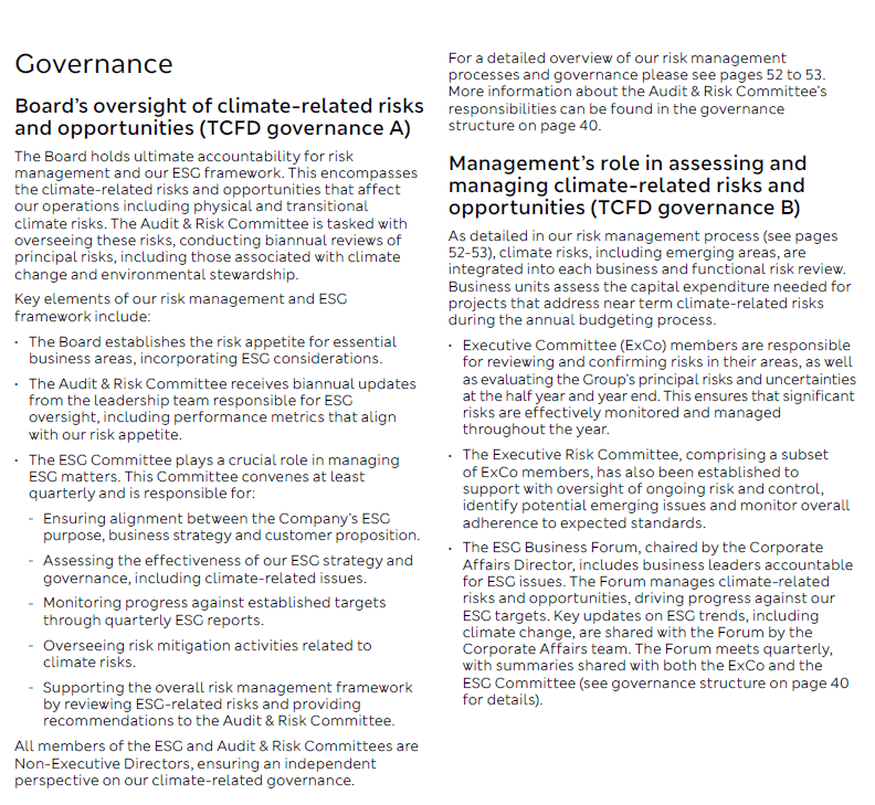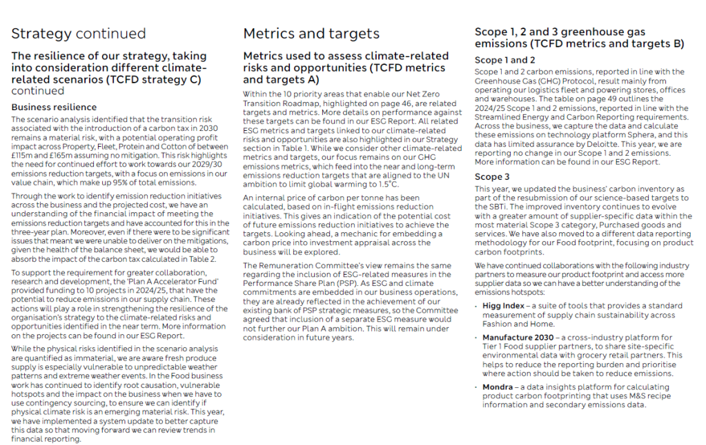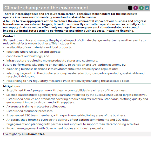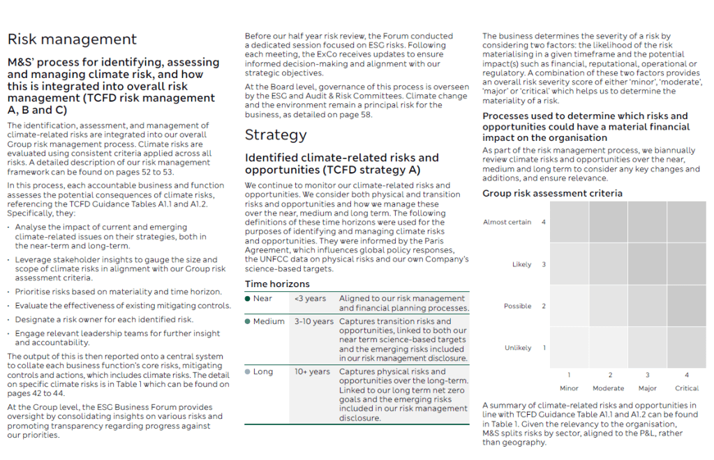 Climate change, TCFD disclosures, LR 6.6.6R, SECR, Companies Act requirements, principal risks Marks and Spencer Group plc – Annual report – 29 March 2025 Industry: retail PRINCIPAL RISKS AND UNCERTAINTIES (extract) Share this: Click to share on X (Opens in new window) X Click to share on Facebook (Opens in new window) Facebook Like Loading...