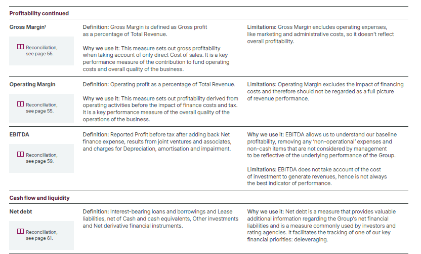CER, Core performance measures, Gross Margin, Operating Margin, Earnings before interest, taxes, depreciation and amortisation (EBITDA) and Net debt are non-GAAP performance measures because they cannot be derived directly from the Financial Statements.