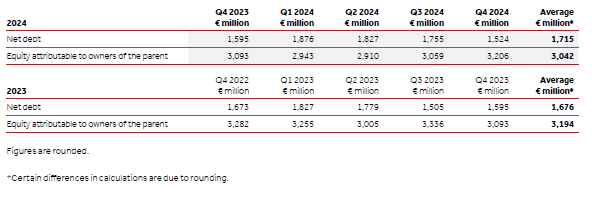 3. Five-quarter average net debt and equity attributable to owners of the parent are calculated as presented below: