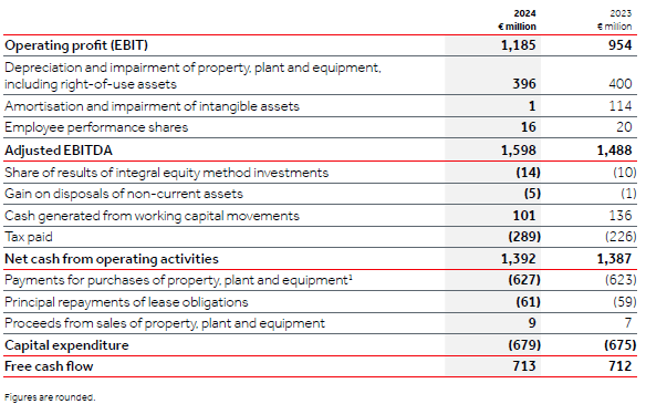 1. Payments for purchases of property, plant and equipment for 2024 include €12 million (2023: €12 million) relating to repayment of borrowings undertaken to finance the purchase of production equipment by the Group’s subsidiary in Nigeria, classified as ‘Repayments of borrowings’ in the consolidated cash flow statement.