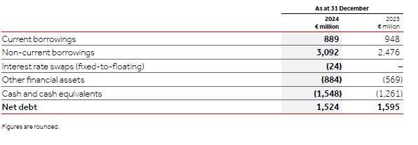 Net debt is an APM used by management to evaluate the Group’s capital structure and leverage. Net debt is defined as current and non-current borrowings, net of the fair value of fixed-to-floating interest rate swaps, less cash and cash equivalents and financial assets (time deposits and money market funds), as illustrated below: