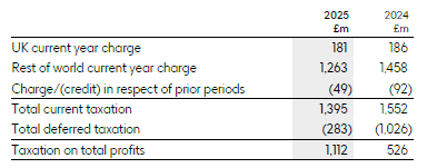 The tax charge for the year was £1,112 million (2024: £526 million). At 31 December 2025, current tax payable was £498 million (2024: £703 million), and current tax recoverable was £288 million (2024: £489 million).