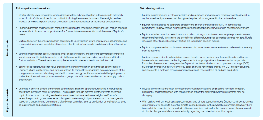 Policy, legal, regulatory, market and technology developments related to climate change, can affect Equinor’s business plans and financial performance. Shifts in stakeholder focus between energy security, affordability and sustainability add uncertainty to delivery and outcomes associated with Equinor’s strategy. In its long-term planning, Equinor analyses how the global energy markets may develop, such as future changes in demand for Equinor’s products (oil, gas and power in key markets). Commodity price sensitivities are presented in a table below, including the World Energy Outlook 2023 (WEO) scenarios presented by International Energy Agency (IEA), and in note 14 Impairments. Equinor assesses climate risk from two perspectives: transition risk, which relates to the financial robustness of the company’s business model and portfolio in various decarbonisation scenarios; and physical climate risk, which relates to the exposure and potential vulnerability of Equinor’s assets to climate-related perils in different climate change scenarios. Equinor’s net-zero strategy and climate related ambitions are responses to the challenges and opportunities presented by the energy transition. Below is a summary of relevant risks and risk adjusting actions: