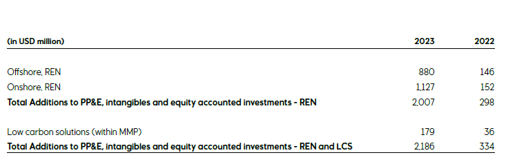 Equinor’s investments in renewables are included as Additions to PP&E, intangibles and equity accounted investments in the REN-segment in note 5 Segments. See table below for details. Over the course of 2023, the acquisition of BeGreen, a commercial-scale offshore wind lease in California, Rio Energy in Brazil and investments related to projects in the US and the UK contributed to the significant increase in the book value compared to the prior year. See note 6 Acquisitions and disposals for more details.