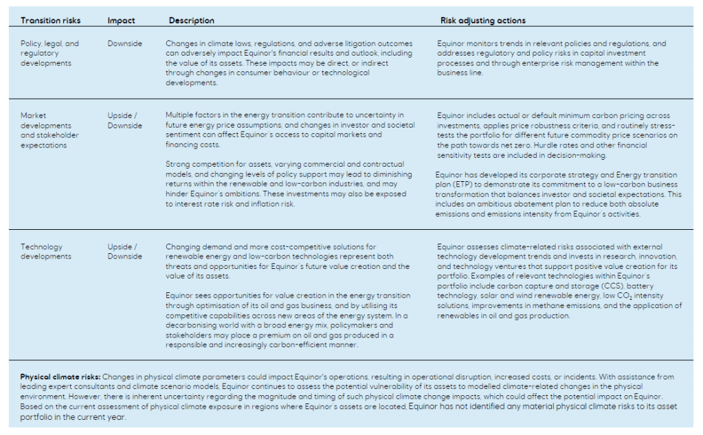 Equinor’s double materiality assessment for 2025 identified transition risks as a material sustainability matter. The table to the right summarises the relevant climate-related risks with potential financial effects.