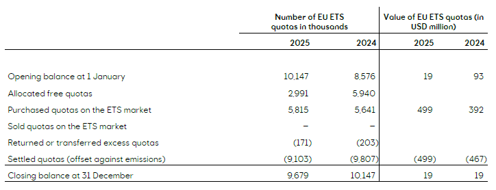 The table below presents the number and associated value of EU ETS and UK ETS quotas that have been received, purchased, and utilised by Equinor on an operated basis. Allocated free quotas consists of actual free quotas received under the ETS during the calendar year. In 2024, Equinor received allocated free quotas for both 2024 and 2023, due to a delay in the allocation schedule. The year-end quota balance consists mainly of free and purchased quotas remaining after the settlement of quotas against current and prior year emissions. The closing balance in USD consists of the value of the remaining quotas after a preliminary settlement allocation for the current year.