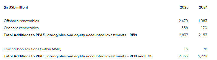 Equinor’s investments in renewables are included as Additions to PP&E, intangibles and equity accounted investments in the REN segment (refer to note 5 Segments). During 2025, the REN segment invested USD 2.1 billion in the Empire Wind project, USD 195 million to acquire the onshore Lyngsåsa wind farm in Sweden, and USD 258 million as contributions to equity accounted investments in Bałtyk 2 & 3.