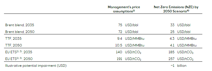 The table below compares management’s price assumptions to the NZE Scenario price set and presents an illustrative impairment amount from applying the NZE Scenario prices to Equinor’s portfolio. Refer to section 3.2 E1 Climate change in the 2025 Annual Report for more details about the scenarios presented in the IEA’s WEO 2025.