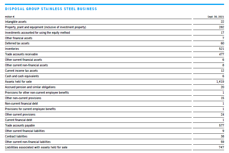 On July 29, 2021, thyssenkrupp signed an agreement to sell the mining business in the Multi Tracks segment to Danish company FLSmidth. The disposal group provides technologies for the mining industry. The transaction is subject to merger control approval. Signing triggers extensive carve-out activities expected to be completed by closing in a period of approximately twelve months. In connection with the initiated sale immediately before the initial classification as a disposal group it has been ensured that the measurement of the assets is in accordance with IAS 36; this has not resulted in any impairment. The assets and liabilities of the disposal group as of September 30, 2021 are presented in the following table; €(30) million of cumulative other comprehensive income presented within equity is attributable to the disposal group.
