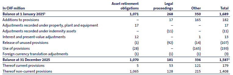 The provision for asset retirement obligations is determined based on estimated future cash outflows and discounted using an average discount rate of 1.23% (previous year: 0.86%). In 2025, adjustments resulting from reassessments in the amount of CHF 15 million were recognised as an adjustment to the carrying amount of property, plant and equipment, with no impact on the income statement. Of this amount, CHF –10 million related to changes in discount rates and CHF 25 million to updates of the cost index and other assumptions applied in determining asset retirement costs. A 10% increase in the estimated asset retirement costs would result in an increase of CHF 118 million in the provision. A deferral of the retirement activities by ten years would increase the provision by CHF 48 million.