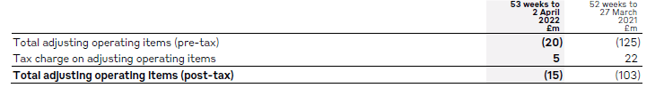 Restructuring costs of £11 million (last year: £30 million) were incurred in the current year, arising primarily as a result of the organisational efficiency programme announced in July 2020 that included the creation of three new business units to enhance product focus, increase agility and elevate quality and, to further streamline of office-based functions and facilities. The costs for the 53 weeks to 2 April 2022 principally relate to redundancies and consulting costs and are recorded in operating expenses. They are presented as an adjusting item, in accordance with the Group’s accounting policy, as the anticipated cost of the restructuring programme is considered material and discrete in nature. A related tax credit of £3 million (last year: £6 million) has also been recognised in the current year.