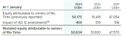The most significant impact of implementing these amendments is from temporary differences related to the Group’s provisions for close-down and restoration, and lease obligations and corresponding capitalised closure costs and right-of-use assets. Adjustments to deferred tax assets and liabilities related to these balances have been recognised as at 1 January 2021, being the beginning of the earliest comparative period to be presented in the financial statements for the year ended 31 December 2023, with the cumulative effect recognised as an adjustment to retained earnings or other components of equity at that date. For other transactions, the impact of which was immaterial, the amendments apply only to those taking place on or after 1 January 2021. The impact on equity attributable to owners of Rio Tinto at 1 January 2023 of implementing the amendments to IAS 12 is as follows: