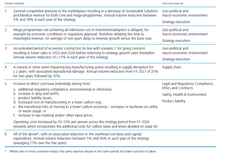 Using the IBP data and the reference points from previous economic cycles, management has created two scenarios to model the impact of a reversal of the partial recovery seen in Sustainable Solutions during 2024 and the continuing effect of destocking within Medical at a regional/market level and aggregated levels on the Group’s profits and cash generation through to January 2026 with consideration also given to the six months beyond this. The impact of climate change and the Group’s goal of Net Zero across all Scopes by 2050 are considered as part of the aforementioned IBP process, from both a revenue and cost perspective, with the anticipated impact (assessed as insignificant over the shorter-term going concern period) incorporated in the forecasts. As a result, the scenario testing noted below does not incorporate any additional sensitivity specific to climate change.