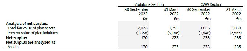 An analysis of the net surplus is provided below for the Vodafone UK Group Pension Scheme, comprising the Vodafone Section and the Cable & Wireless Section (‘CWW Section’).