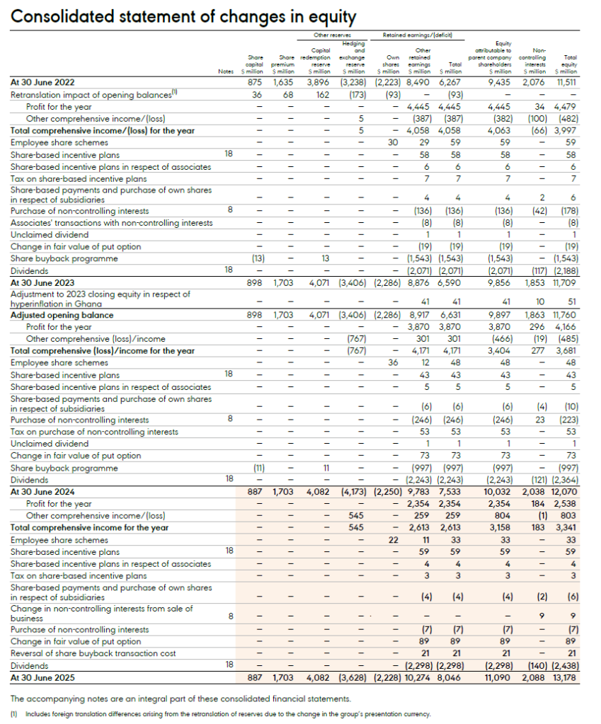The group’s consolidated financial statements include the results and financial position of its operations in hyperinflationary economies restated to the measuring unit current at the end of each period, with hyperinflationary gains and losses in respect of monetary items being reported in finance income and charges. Comparative amounts presented in the consolidated financial statements are not restated. When applying IAS 29 on an ongoing basis, comparatives in stable currency are not restated and the effect of inflating opening net assets to the measuring unit current at the end of the reporting period is presented in other comprehensive income. The movement in the publicly available official price index for the year ended 30 June 2025 was 35% (2024 – 72%; 2023 – 38%) in Türkiye and 16% (2024 – 23%) in Ghana. The inflation rate used by the group for Venezuela is provided by an independent valuer because no reliable, officially published rate is available. Movement in the price index for the year ended 30 June 2025 was 171% (2024 – 77%; 2023 – 382%) in Venezuela.