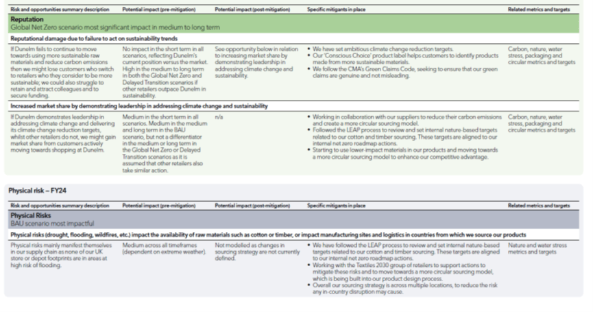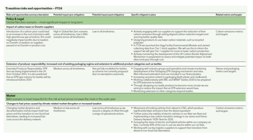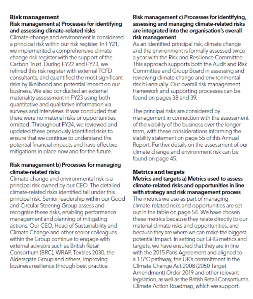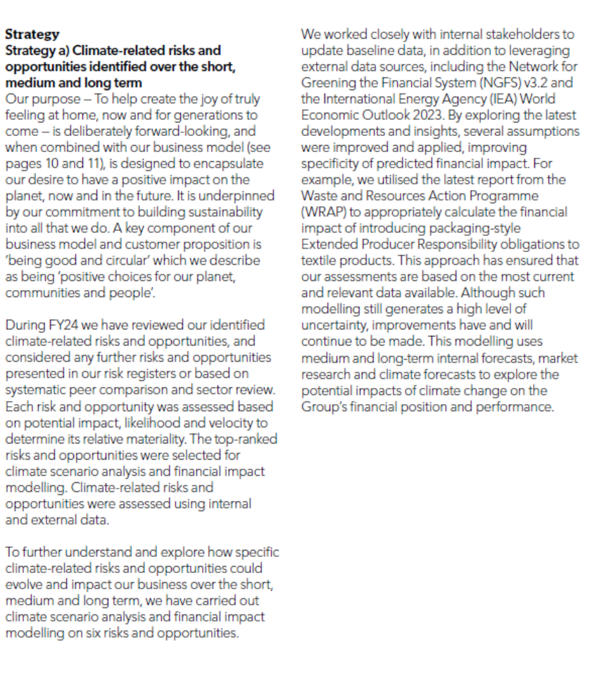 Climate change has been managed as a principal risk for the Group since FY19; the current view of this risk is described in detail on page 45. Following release of our first full TCFD report in FY22 and progress made in FY23, we have developed our approach to assessing risks and opportunities and remain committed to improving disclosures in line with evolving requirements and practice. This year, we brought in-house the assessment of financial impact for climate related risks and opportunities enabling more tailored data and assumptions to be used. Additionally, new internal processes have helped improve focus on potential impacts across the business.