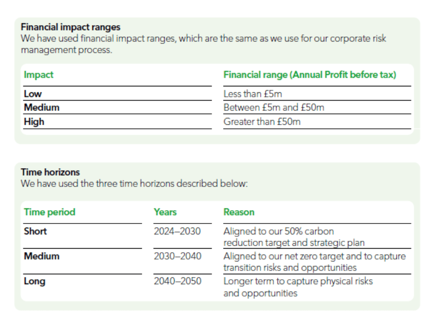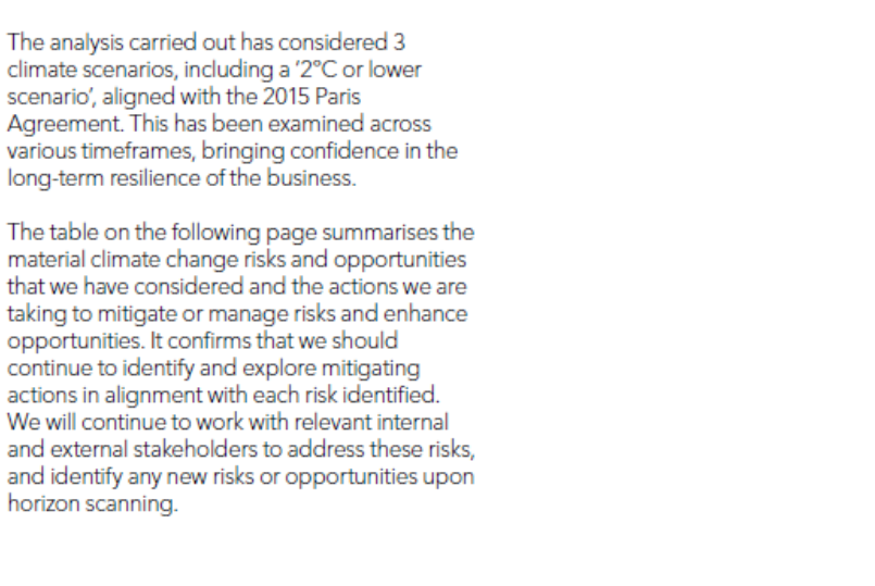 Our report continues to be compliant with TCFD disclosures and UK Listing Rules. We continue to consider the potential financial impacts of climate change in the cash flow scenario modelling within our viability statement on page 55 and in our accounting policies note on page 137 of the financial statements.