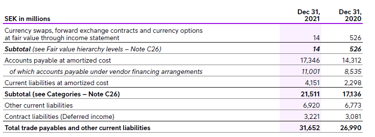 Telia Company has arrangements with several banks under which the banks offer Telia Company’s vendors the option to receive earlier payment of Telia Company’s accounts payables. Vendors utilizing the financing arrangement pay a credit fee to the bank. Telia Company does not pay any credit fees and does not provide any additional collateral or guarantee to the bank. Based on Telia Company’s assessment the liabilities under the vendor financing arrangement are closely related to operating purchase activities and the financing arrangement does not lead to any significant change in the nature or function of the liabilities. These liabilities are therefore classified as accounts payables with separate disclosures in the notes. The credit period does not exceed 12 months and the accounts payables are therefore not discounted. Account payables under vendor financing arrangements were SEK 11,001 million per December 31, 2021 (8,535). See Note C25.