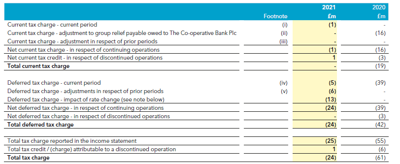 The net tax charge of £25m on a continuing profit before tax of £57m gives an effective tax rate of 45%, which is higher than the standard rate of 19%. The main reasons for the increase are the impact of restating deferred tax following the announcement of the Corporation Tax rate change enacted in the 2021 Budget and depreciation on non-qualifying assets, being tax debits of £13m and £11m respectively. See footnotes (vii) and (x) for more detail. Off-setting this, as noted in foot note (ii), was a non-taxable accounting credit taken to the income statement on the final settlement of the Co-operative Bank group relief creditor which reduces the effective tax rate after the above items by 33%.