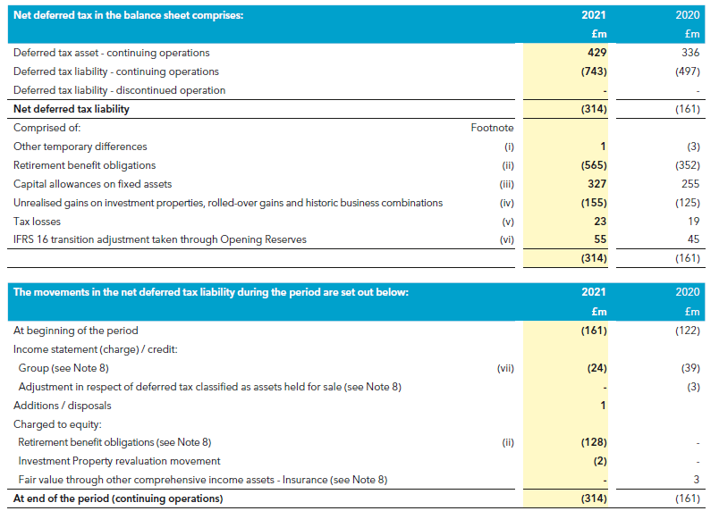 ii) This amount represents the theoretical future tax cost to the Group in respect of the current pension scheme surplus. The overall increase in 2021 was £213m. This is primarily due to the impact of the rate change going from 19% to 25%, leading to a £136m increase in the liability. In addition there is a £76m increase in liability for the movement in the total schemes’ surpluses during the year.