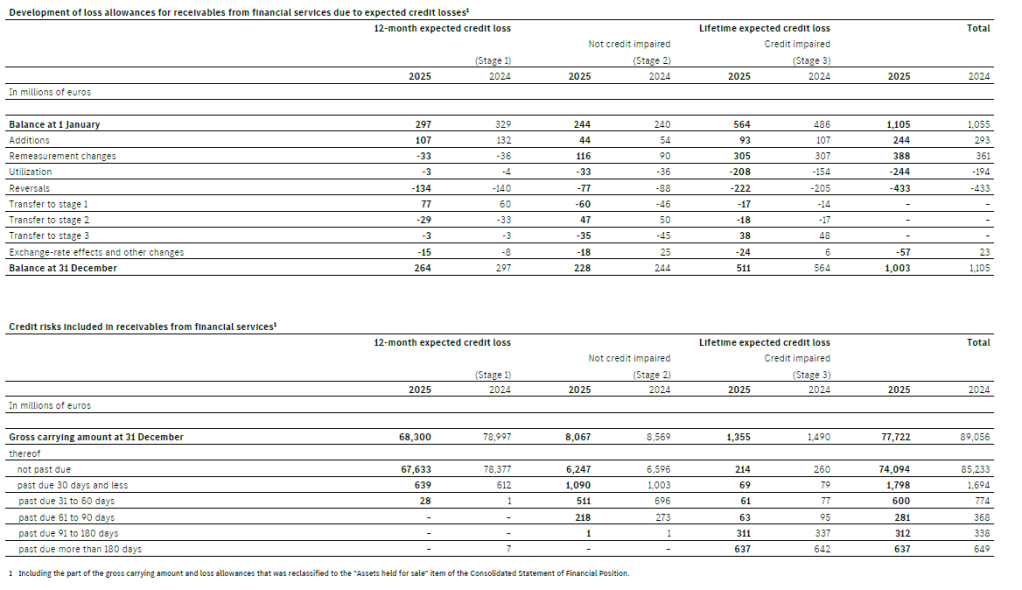 The loss allowances for receivables from financial services due to expected credit losses are shown in the table “Development of loss allowances for receivables from financial services due to expected credit losses”. The carrying amounts of receivables from financial services based on modified contracts that are shown in stage 2 and 3 amounted to €586 million at 31 December 2025 (2024: €580 million). In addition, carrying amounts of €140 million in connection with contractual modifications were reclassified at 31 December 2025 from stage 2 and 3 into stage 1 (2024: €91 million).