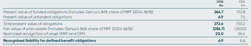 We have accounted for our section of the scheme and our share of any orphan assets and liabilities, which together represent approximately 86% of the MPF (2024: 86%). Although the MPF is managed on a sectionalised basis, it is a ‘last man standing’ scheme, which means that all participating employers are jointly and severally liable for all of the fund’s liabilities. With effect from 30 June 2013, Genus’s remaining active members ceased accruing benefits in the fund and became deferred pensioners.