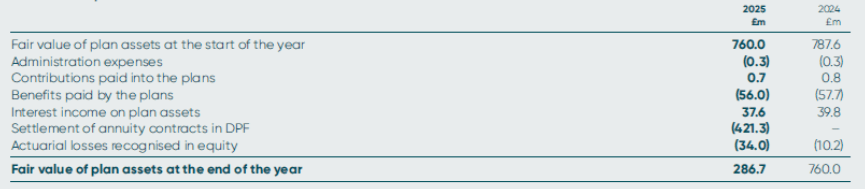 Formal notice to wind-up the DPF was given by the scheme’s sponsoring employers on 13 February 2025, as all member benefits have now been secured with insurance companies, following the completion of the GMP equalisation exercise. Wind-up is expected to complete in the first quarter of 2026. As a result a significant number of members have now received their individual pension policies resulting in a net settlement of asset and liabilities of £421m, as the trustees are no longer liable. The remaining individual pension policies are expected to be issued to members during the second half of 2025.