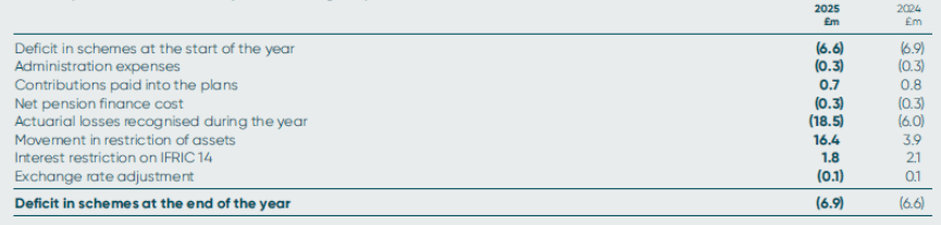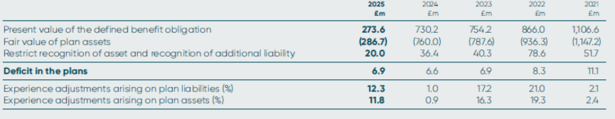 At 30 June 2025, the DPF, which includes a £5.5m separate reserve held against future unknown liabilities materialising, was in an overall net pension asset position of £3.8m (2024: £4.5m). However, in the judgement of the Company, there is no unconditional and unilateral right to this surplus. The trustees, in relation to any scheme surplus, still needs to complete certain statutory requirements with the pension regulator and scheme members as part of the wind-up process and therefore in line with IFRIC 14, the recognition of this asset is restricted.
