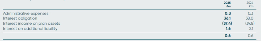 The scheme liabilities for the unfunded retirement health benefit plan amounted to £0.5m (2024: £0.5m), based on IAS 19’s methods and assumptions. This amount is included within retirement benefit obligations in the Group Balance Sheet. Interest on plan liabilities amounted to £nil (2024: £nil).