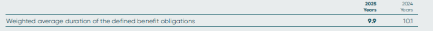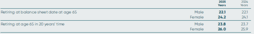 The mortality assumptions used are consistent with those recommended by the schemes’ actuaries and reflect the latest available tables, adjusted for the experience of the scheme where appropriate. For 2025 and 2024, the mortality tables used are 100% of the S3PMA (males)/S3PFA_M (females) all lives tables, with birth year and CMI 2023 projections with parameters of Sk=7.0 and A=0.5% and weighting parameters of w2020=0%, w2021=0%, w2022=15% and w2023=15%, subject to a long-term rate of improvement of 1.50% per annum for males and females.
