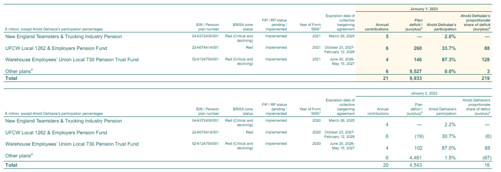In 2023, the Company expects its total contributions to multi-employer defined benefit plans to be €22 million, which includes RP contribution increases where applicable. Ahold Delhaize has a risk of increased contributions and withdrawal liability (upon a withdrawal) if any of the participating employers in an underfunded MEP withdraw from the plan or become insolvent and are no longer able to meet their contribution requirements or if the MEP itself no longer has sufficient assets available to fund its short-term obligations to the participants in the plan. If and when a withdrawal liability is assessed, it may be substantially higher than the proportionate share disclosed above. Any adjustment for a withdrawal liability will be recorded when it is probable that a liability exists and the amount can be reliably estimated. Ahold Delhaize does not have a contractual agreement with any MEP that determines how a deficit will be funded, except for the FELRA and MAP settlement agreement as described below.