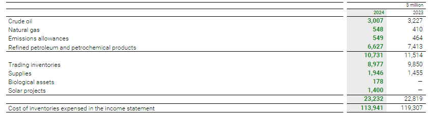 The inventory valuation at 31 December 2024 is stated net of a provision of $388 million (2023 $497 million) to write down inventories to their net realizable value, of which $199 million (2023 $310 million) relates to hydrocarbon inventories. The net credit to the income statement in the year in respect of inventory net realizable value provisions was $77 million (2023 $87 million charge), of which $104 million credit (2023 $112 million charge) related to hydrocarbon inventories.