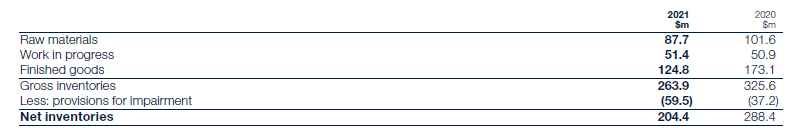 Inventories of $128.8m are expected to be realised within 12 months of the balance sheet date (2020 – $165.0m) and $75.6m after 12 months (2020 – $123.4m).