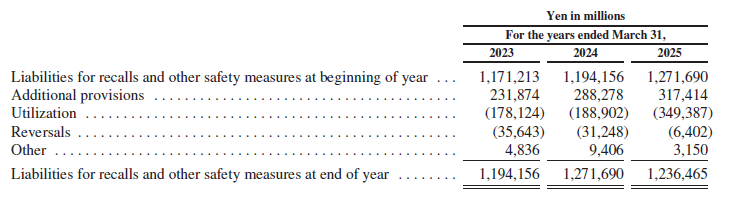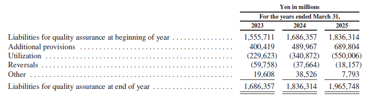 The table below shows the net changes in liabilities for recalls and other safety measures which are comprised in liabilities for quality assurance above for the years ended March 31, 2023, 2024 and 2025.