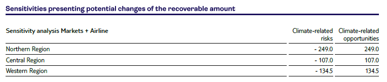 In the light of the uncertainties regarding the long-term financial burden from climate-related risks, TUI has calculated sensitivities for the particularly affected Markets + Airline. These are presented in the section on ‘Goodwill’. The sensitivities relate to assumptions on the development of climate-related risks in general, the development of prices for alternative fuels and emission certificates and the potential for passing on climate change-related costs to our customers. Overall, TUI does not regard climate-related risks as a triggering event for carrying out impairment tests.