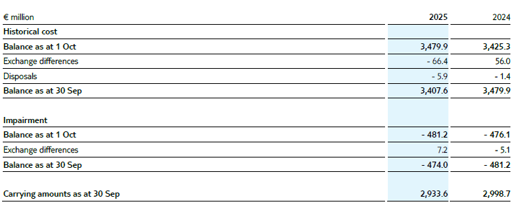In accordance with the provisions of IAS 21, goodwill allocated to the individual segments and sectors was recognised in the functional currency of the subsidiaries and subsequently translated when preparing the consolidated financial statements. Similar to the treatment of other differences from the translation of annual financial statements of foreign subsidiaries, differences due to exchange rate fluctuations between the exchange rate at the date of acquisition of the subsidiary and the exchange rate at the balance sheet date are taken directly to equity outside profit and loss and disclosed as a separate item. In financial year 2025, an decrease in the carrying amount of goodwill of €59.2m (previous year increase of €50.9m) resulted from foreign exchange differences.
