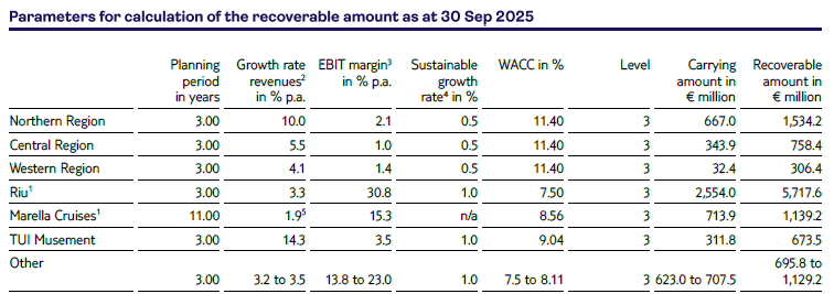 For all CGUs, the recoverable amount was determined on the basis of fair value less costs of disposal, being the higher value compared to the value in use. The fair value was calculated by discounting the expected cashflows. This was based on the medium-term plan for the respective entity as at 30 September 2025. Different from the prior year, the impairment test for Marella Cruises at 30 September 2025 has been prepared under the assumption that future discounted cash flows are derived from the remaining useful life of the existing fleet. Budgeted revenues and EBIT margins are based on expectations of the future business performance. Refer to the section ‘Key judgements, assumptions and estimates’.