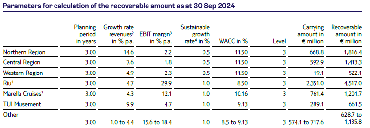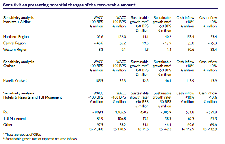 Subdued macroeconomic growth and inflationary pressures due to geo- and economic-political conflicts may increase price elasticity among customers, a trend further amplified by the transparency of online platforms and artificial intelligence-driven booking platforms. This risk primarily affects the Markets + Airline. As a tour operator, these units typically enter into fixed contractual commitments for flight and hotel capacity prior to the season, creating exposure to underutilization risk or distressed pricing in the event of declining demand. The valuation of the assets of these businesses incorporates the assumption that the accelerated roll-out of dynamic packaging solutions – where TUI does not pre-commit to fixed capacity – as well as the strategic transformation of Markets & Airline into an integrated platform with cross-border capacity allocation will mitigate this risk. For the impairment test of assets within Markets + Airline, a discount rate (WACC) including a risk premium of 2.4% has been applied to reflect amongst others these uncertainties. Sensitivity analyses performed on the goodwill impairment tests for the Northern Region, Western Region, and Central Region did not indicate any impairment (see section ‘Goodwill’).