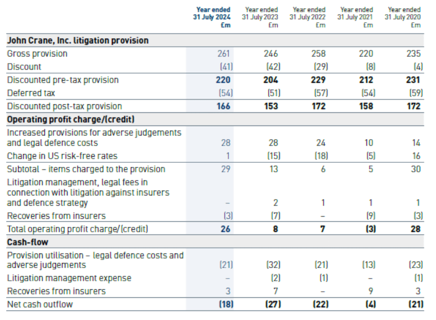 John Crane, Inc. (JCI), a subsidiary of the Group, is one of many co-defendants in litigation relating to products previously manufactured which contained asbestos. Provision of £220m (FY2023: £204m) has been made for the future defence costs which the Group is expected to incur and the expected costs of future adverse judgements against JCI. Whilst well-established incidence curves can be used to estimate the likely future pattern of asbestos-related disease, JCI’s claims experience is significantly impacted by other factors which influence the US litigation environment. These can include: changing approaches on the part of the plaintiffs’ bar; changing attitudes amongst the judiciary at both trial and appellate levels; and legislative and procedural changes in both the state and federal court systems. Because of the significant uncertainty associated with the future level of asbestos claims and of the costs arising out of the related litigation, there can be no guarantee that the assumptions used to estimate the provision will result in an accurate prediction of the actual costs that will be incurred.