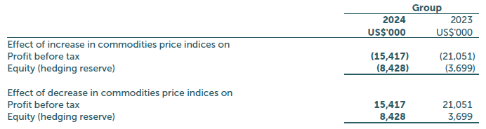 At the balance sheet date, a 1% (2023: 1%) increase/decrease of the commodities price indices, with all other variables held constant, would have (decreased)/increased profit before tax and equity by the amounts as shown below: