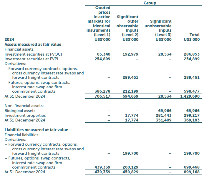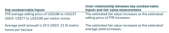 During the financial year, the Group harvested approximately 4,109,000 metric tonnes (2023: 4,450,000 metric tonnes) of fresh fruit bunches (“FFB”), which had a fair value less estimated point-of-sale costs of approximately US$699,292,000 (2023: US$663,152,000). The fair value of FFB was determined with reference to their monthly average market prices during the year.