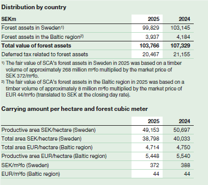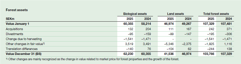 For 2025, the value of the land asset amounted to SEK 41,536m (46,974), meaning the total value of the forest asset of SEK 103,766m (107,329) less biological assets of SEK 62,230m (60,355).