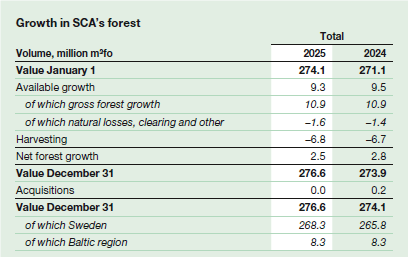 The market value of SCA’s forest asset is based on completed forest transactions, where the value is calculated by multiplying the average price level in the regions where SCA owns forests by SCA’s standing volume. SCA’s forest holdings in Sweden are made up of approximately 2.6 (2.6) million hectares of forest assets in northern Sweden, of which approximately 2.0 (2.0) million is productive forest land. SCA also owns just over 67,000 (66,000) hectares of forest land and 10,000 (11,000) hectares of other land in the Baltic region that can potentially be converted to forest land or be sold. Gross growth amounts to approximately 10.9 (10.9) million m3fo per year on productive forest area. Net growth, meaning growth after harvesting and natural losses, was estimated in 2025 at approximately 2.5 (2.7) million m3fo in Sweden and 0 (0.1) million m3fo in the Baltic region. As of December 31, 2025, timber volume was estimated to amount to approximately 268 (266) million m3fo in Sweden and approximately 8 (8) million m3fo in the Baltic region.