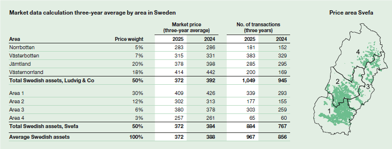 The total value of SCA’s forest assets is based on transactions in the areas where SCA owns forest properties. Each supplier’s price statistics for northern Sweden are divided into a number of regions. Ludvig & Co delivers statistics by county in northern Sweden and Svefa delivers its statistics by forest price area, as shown in the figure Price area Svefa, refer to the following page. All of SCA’s Swedish holdings are located in northern Sweden with a concentration in southern Norrland, as shown in the table Market data calculation three-year average by area in Sweden, refer to the following page. The price differences between the classes in the valuation are, in SCA’s opinion, mainly motivated by distance to industries (transportation costs), site productivity and distance to major cities/towns. In the suppliers’ data for 2025, SCA was a party in approximately 3% (2) of the transactions.