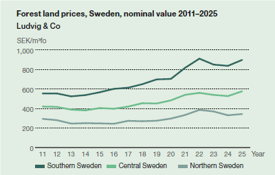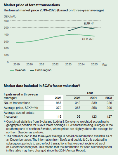 The three-year average price in 2025 was SEK 372/m3fo (388) and is used to determine the total average value per m3fo of SCA’s forest assets in Sweden. The corresponding price for the Baltic region is EUR 44/m3fo (44).