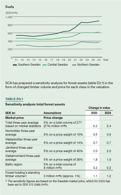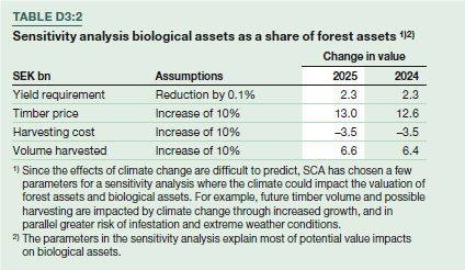 Climate-related risks and opportunities have been assessed using scenario analysis where both physical and transition risks were assessed, see the risk section of the Board of Directors’ Report. Climate change may mean a longer growing season, which may lead to an increase in harvesting volume. Increased risk of impact from extreme weather events such as storms, longer droughts or increased risk of infestation could reduce harvestable volume and increase harvesting costs. Increased demand for renewable products can boost demand for products based on forest raw materials, which could lead to higher timber prices. Political decisions and certification requirements that may restrict the extraction of raw material, the right to cultivate the forest and requirements for increased set-asides may reduce harvestable volume. Increased or decreased harvesting volume can in turn affect the supply of wood in the market and thus wood prices. The choice to participate in, or abstain from, voluntary certification systems can also affect wood prices. When valuing biological assets, these risks and opportunities are taken into account, for example the effects of climate change. Given the uncertainty about when the effects will occur in time and with what magnitude, the long production cycle of 100 years and the fact that they are expected to have both positive and negative effects, the Company’s best assessment in 2025 was that these had a neutral effect on the value of biological assets.