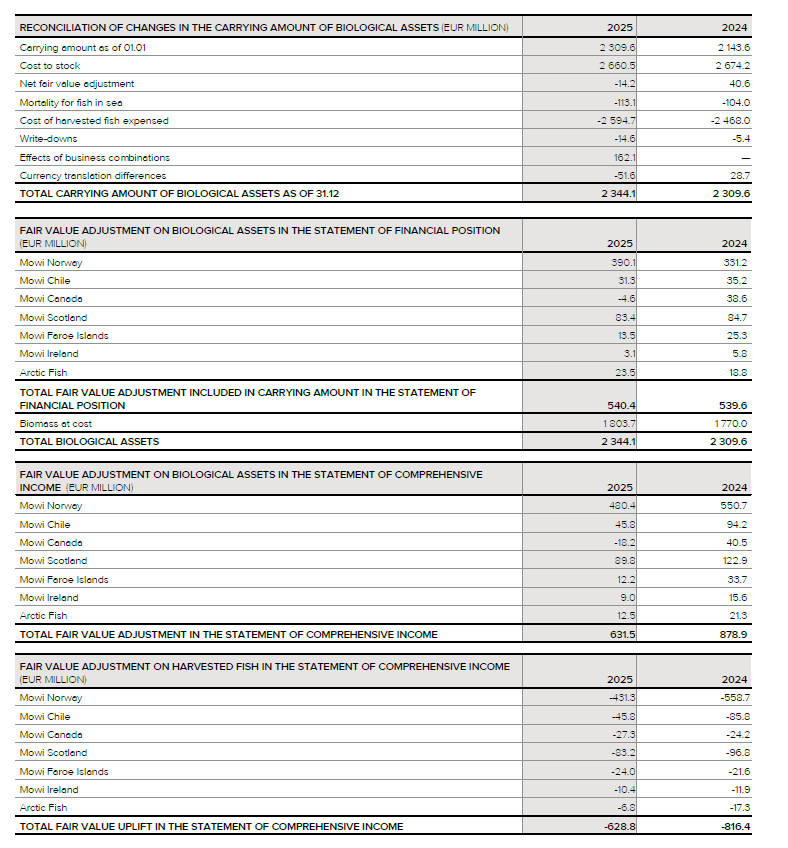 The quality of the biomass: The quality of the biomass can be difficult to assess prior to harvesting, if the reason for downgrading is related to muscle quality (e.g. the effect of Kudoa in Canada). In Norway downgraded fish is normally priced according to standard rates of deduction compared to a Superior quality fish. In our fair value model for salmon of Norwegian origin, we have used EUR 2.00 as deduction from Superior to Production grade quality. In other countries the price deductions related to quality are not as standardised. Due to the challenging winter sore situation in Norway in the first half, group superior rate was 91% in 2025 (87% in 2024). A one percentage point change from Superior quality to Production grade quality would result in a change in value of EUR -6.8 million.