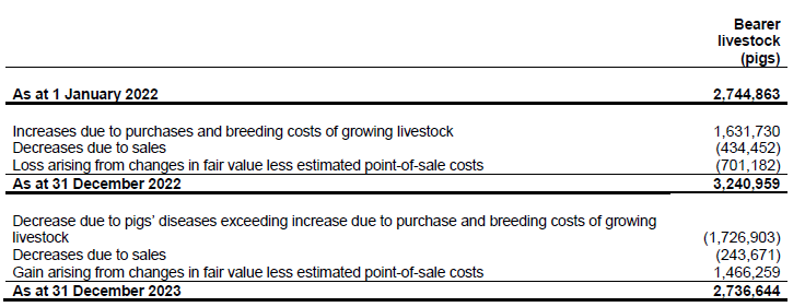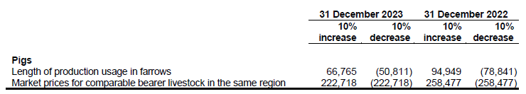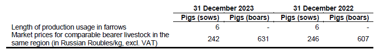 The fair value of consumable livestock (pigs) is determined based on the market prices multiplied by the livestock weight at the end of each reporting period, adjusted for the expected culling rates. The average market price of consumable pigs being the key input used in the fair value measurement was 108.3 Russian Roubles per kilogram, excluding VAT, as at 31 December 2023 (31 December 2022: 98.5 Russian Roubles per kilogram, excluding VAT).