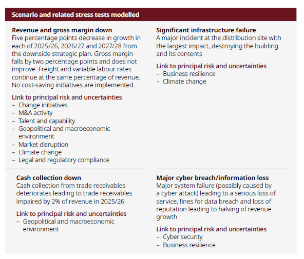 In its assessment of the Group’s viability, the Board has reviewed the assessment period and has determined that a three-year period to 31 March 2028 continues to be most appropriate. The robustness of the strategic plan is higher in the first three years. The Group has few contracts with either customers or suppliers extending beyond three years and, in the main, contracts are for one year or less. The business operates with a minimal forward order book, generally taking orders and shipping them on the same day. In addition, as more business becomes digital and we become more agile, speed of change increases and so visibility is relatively short term. Of the Group’s long-term obligations, the UK pension scheme is the largest and its triennial funding valuation forms the basis of our agreeing its funding with its trustee. Our share-based payment schemes are also mainly for three years.