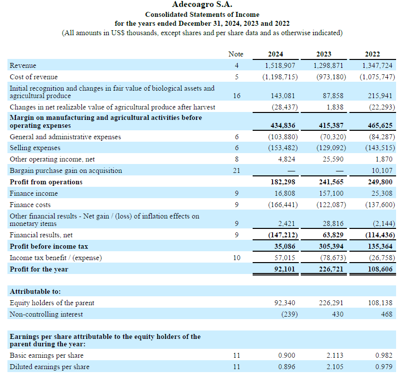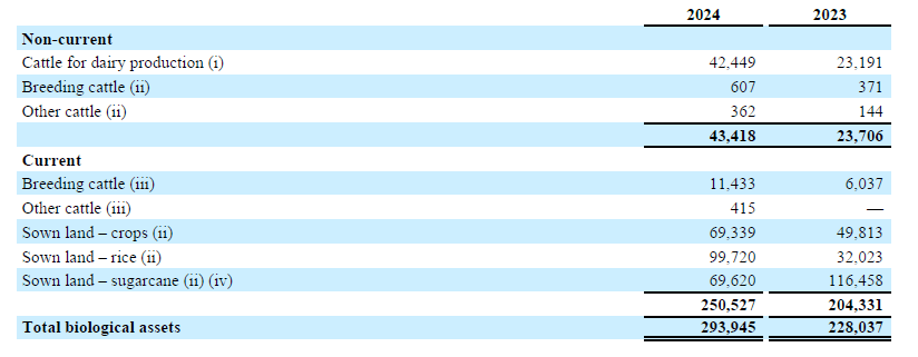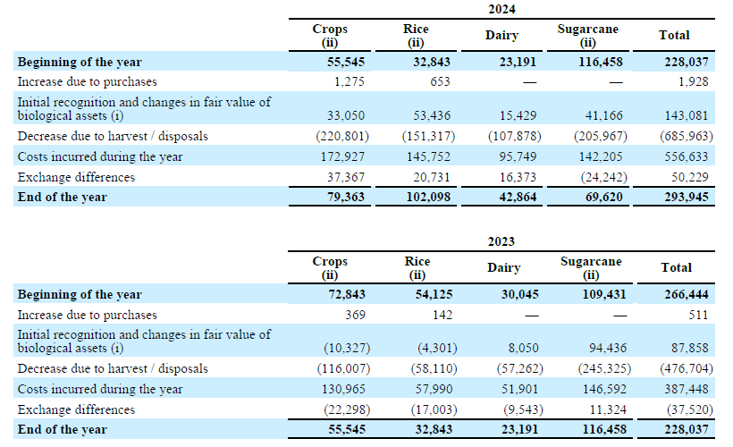 (i) Biological asset with a production cycle of more than one year (that is dairy cattle) generated “Initial recognition and changes in fair value of biological assets” amounting to US$14,263 for the year ended December 31, 2024 (2023: US$15,795). In 2024, an amount of US$525 (2023: US$3,999) was attributable to price changes, and an amount of US$13,738 (2023: US$11,796) was attributable to physical changes.